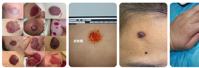 皮膚鏡可以放大觀察皮損的血管結(jié)構(gòu)特征,有助于與其他皮膚病變鑒別。